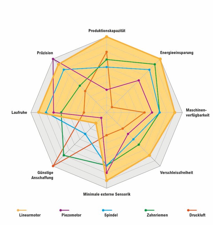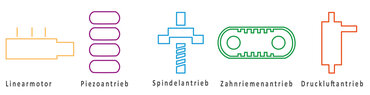 Linearmotor, Spindelantrieb, Zahnriemen, Piezo und Druckluft im Vergleich.